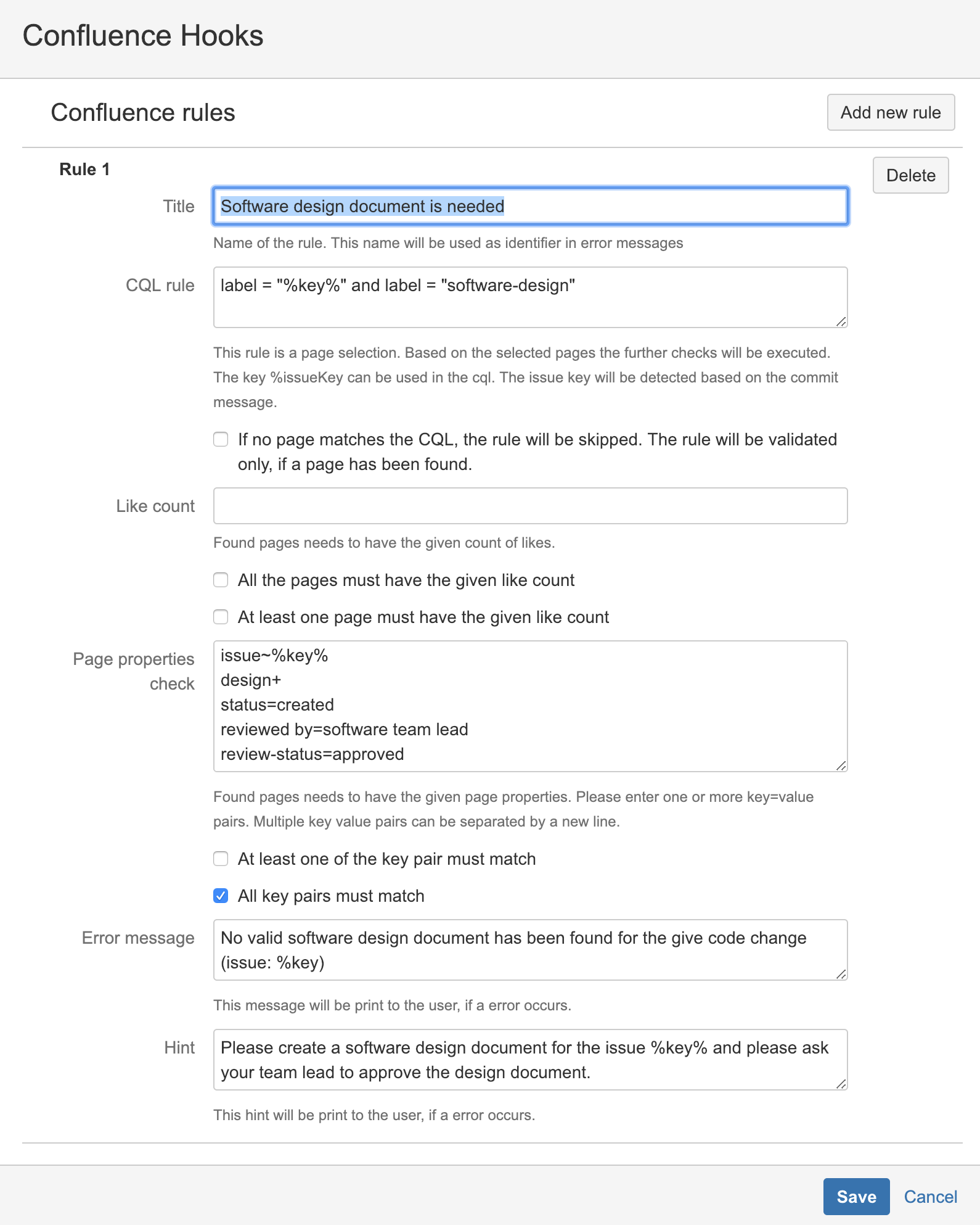 | DEM-3 - More Bitbucket hooks | DEM-3 | title ~ "%key%" and label = "software-design" | Match the given page, because the page title contains the issue key ant the label "software-design" is given |