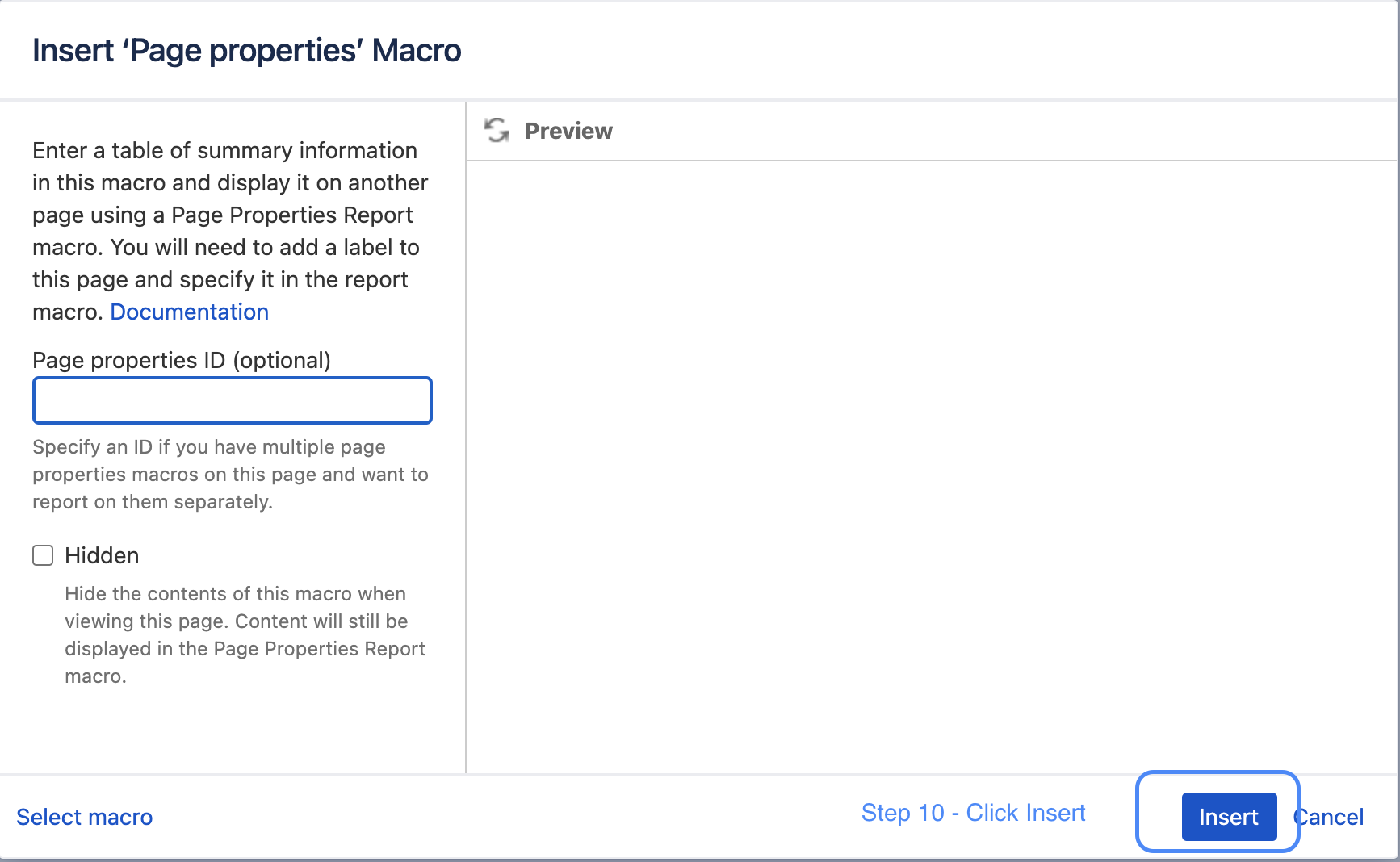 ![]() | Step 8: You can choose any page name, because the page selection in our example is done via labels only. Step 9: In order to evaluate the page properties, a Confluence page must also contain a page properties macro. Therefore the macro is added in this step |