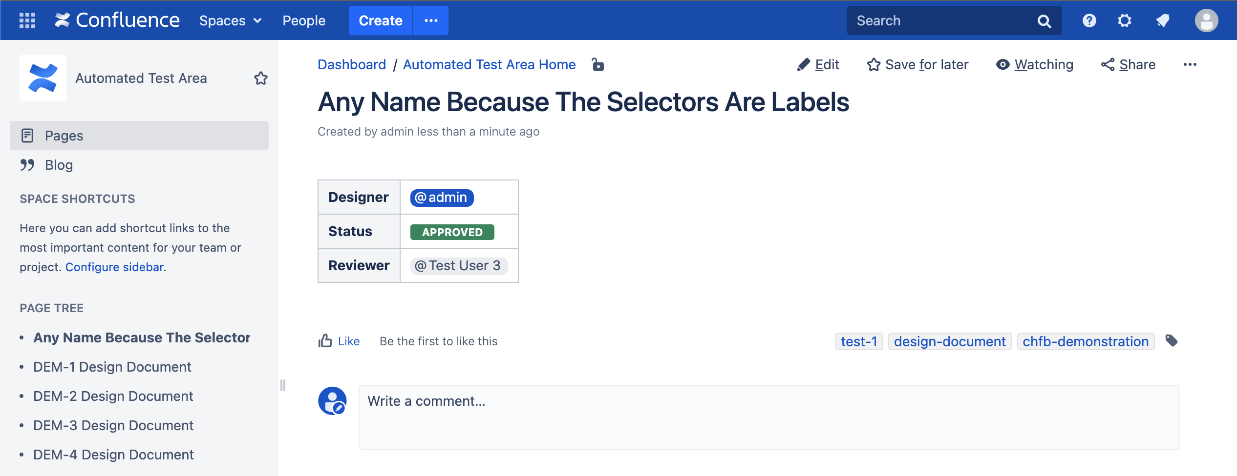 ![]() | Step 12: Because the page selection in our example is done via labels only, we have to add 3 labels to the page test-1 design-document chfb-demonstration |