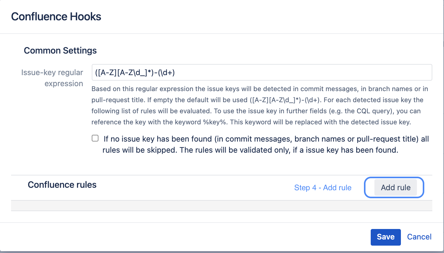 Step 4 - Add Rule: Confluence rules can be added using the "Add new rule" button. Any number of rules can be defined. For a valid hook configuration at least one rule has to be added.