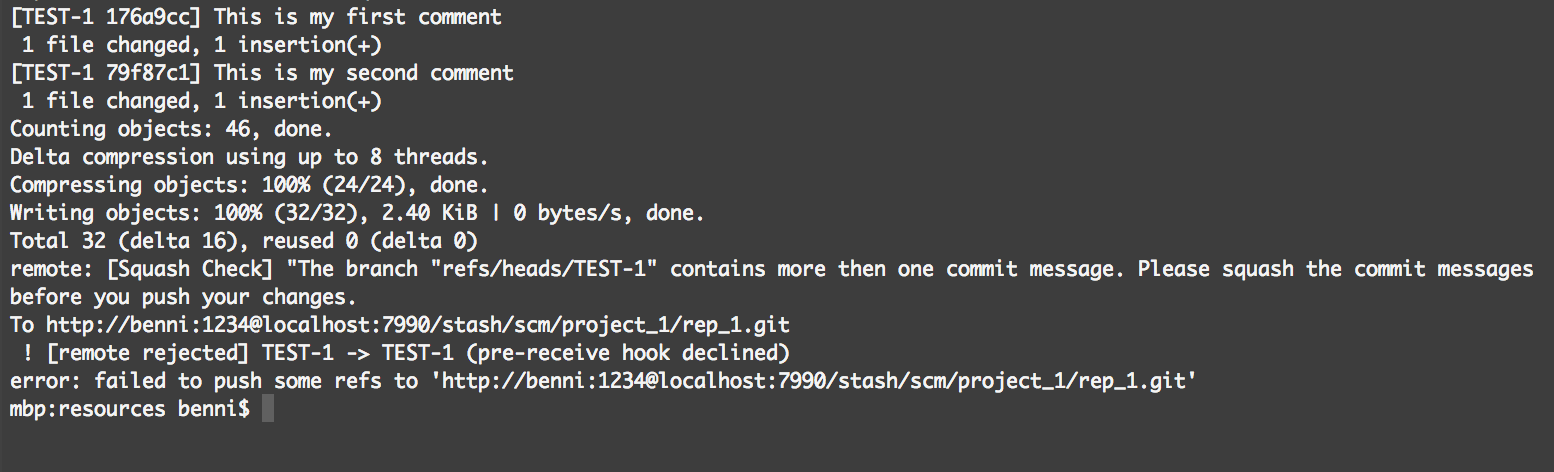 | Exception | If this option is enabled, the related text field should contain one or more valid user groups. If the user which will do the merge/push is in one of the given groups, then the checks will not be evaluated. Groups can be separated via coma (group1,group2) | This is a push example, but the behavior regarding the merge hook is the same. If the option is set, and the group admin is configured. Additionally there are several commits which would block a push or merge (e.g. no issue key reference is available), then the behaviour is: