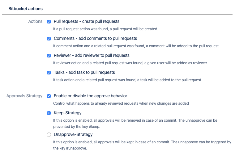 In the same way as the Jira actions the Bitbucket actions can be enabled exclusive. So you can decide which actions you would like to use and which actions you would like to ignore.