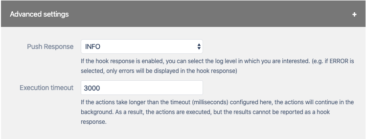 | Enable Push Response | The result of the push will be printed as hook response. You can set the severity of the hook responses or you can disable the hook response. Information If the push response is disabled, the hook will execute the smart actions in background and the push will come back directly. |