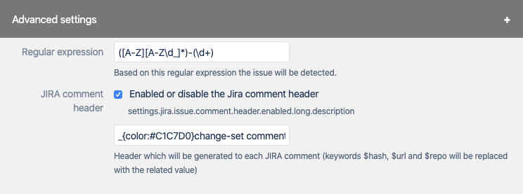 In addition, there is an advanced section where the configuration regarding issue-key detection rules and the Jira comment header can be done.
